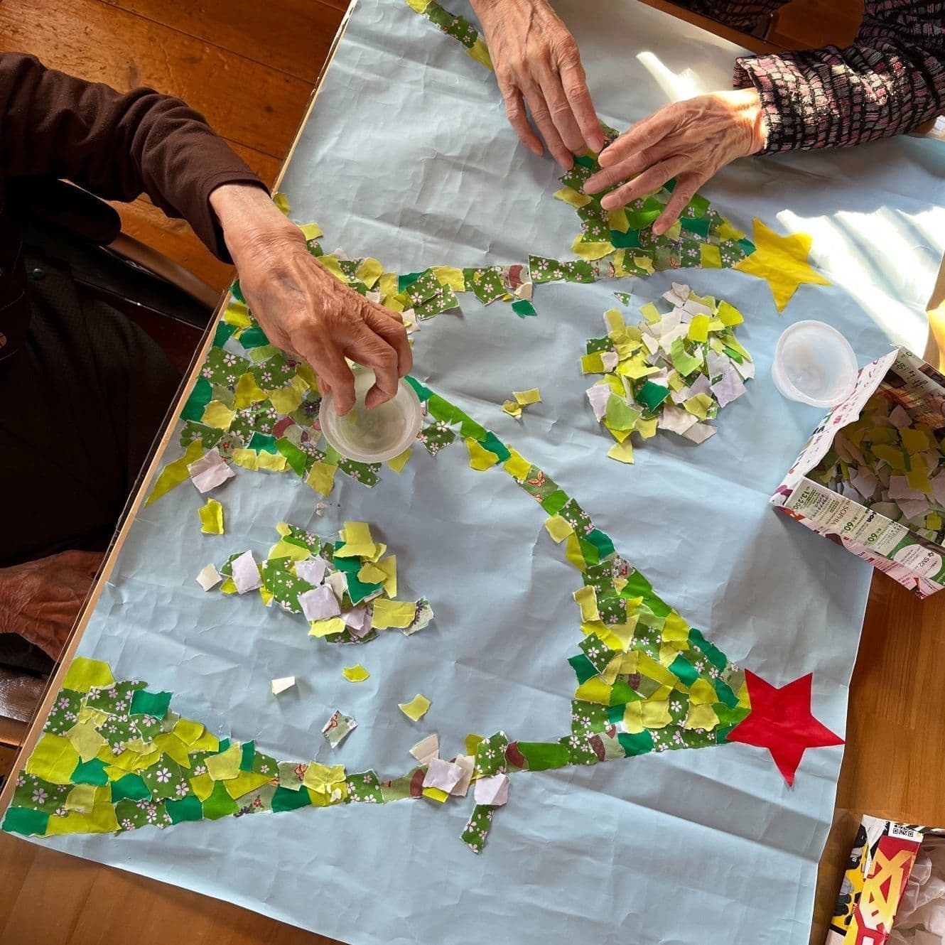 貼り絵、編み物、風船バレー、発声練習、手足の体操、体を使ったダンスなどを行なっています。